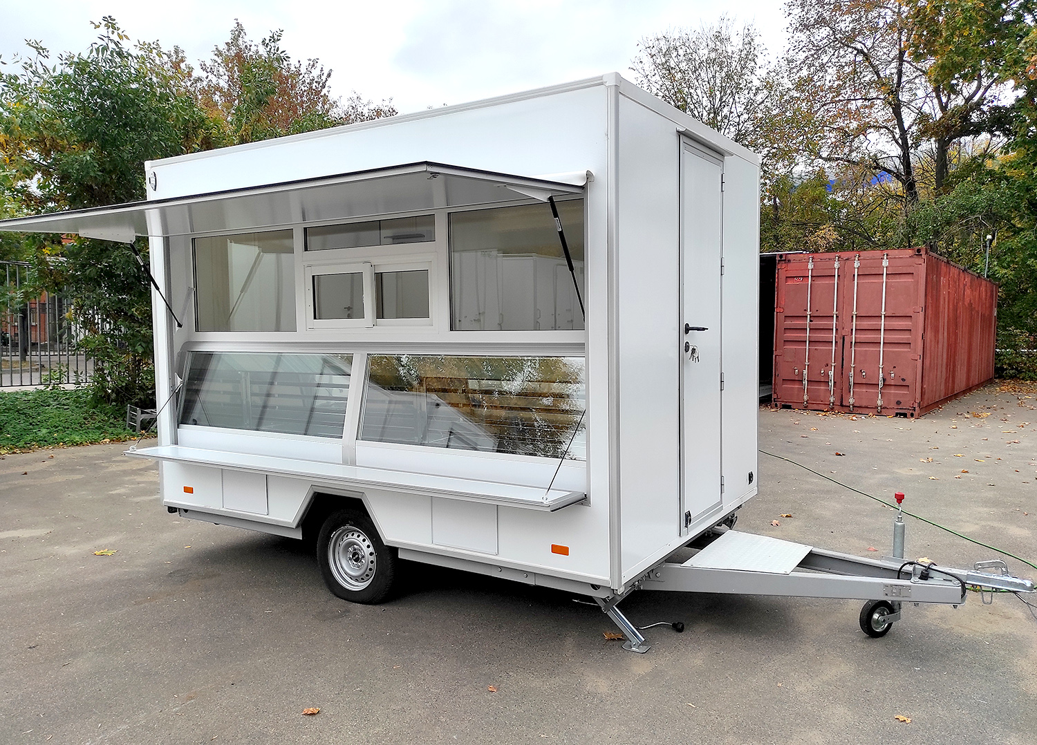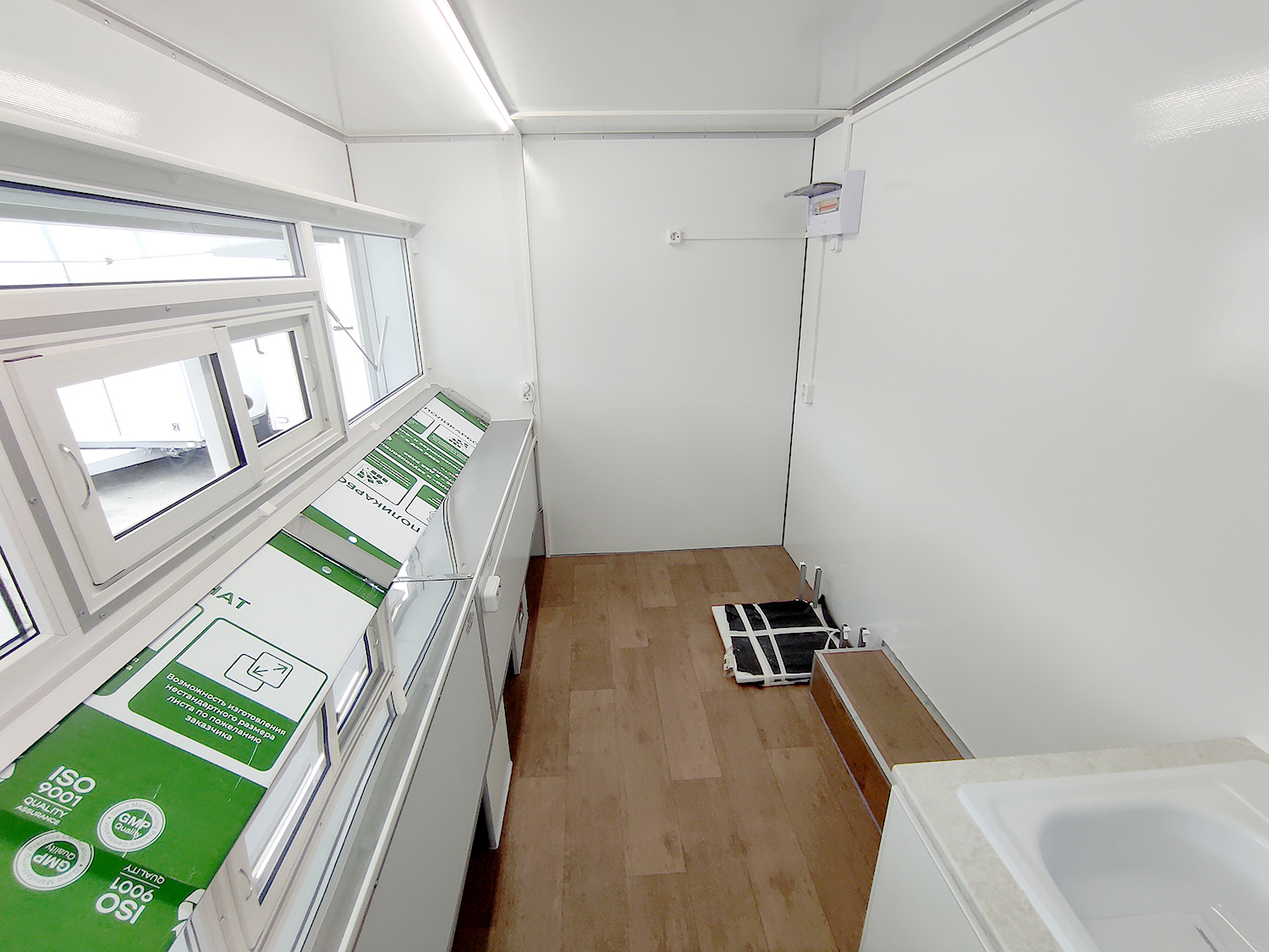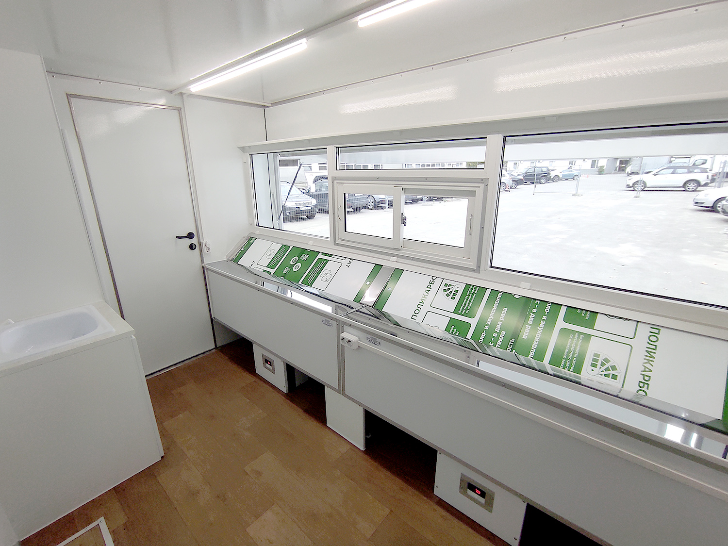 в данной комплектации: - ПВХ остекление со стеклопакетами - гардеробный шкаф с дверью - торговая мебель из ламинированной ДСП по правой стенке - автономное водоснабжение (тумба с раковиной, погружной насос, контактный кран, две канистры по 20л, блок питания 12В) - блок розеток + внутреннее освещение (один светильник)