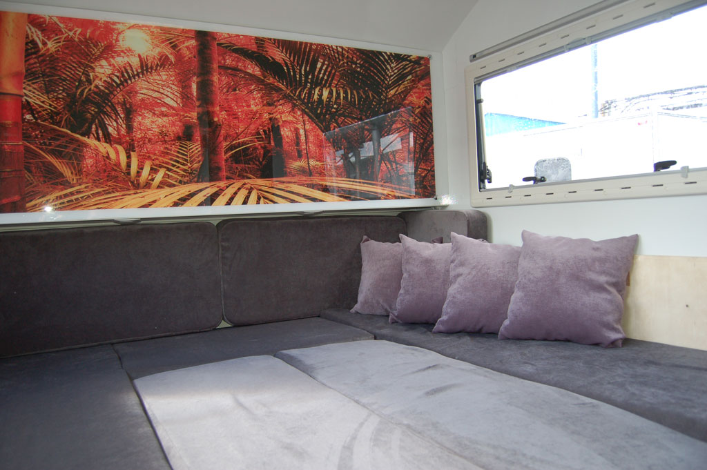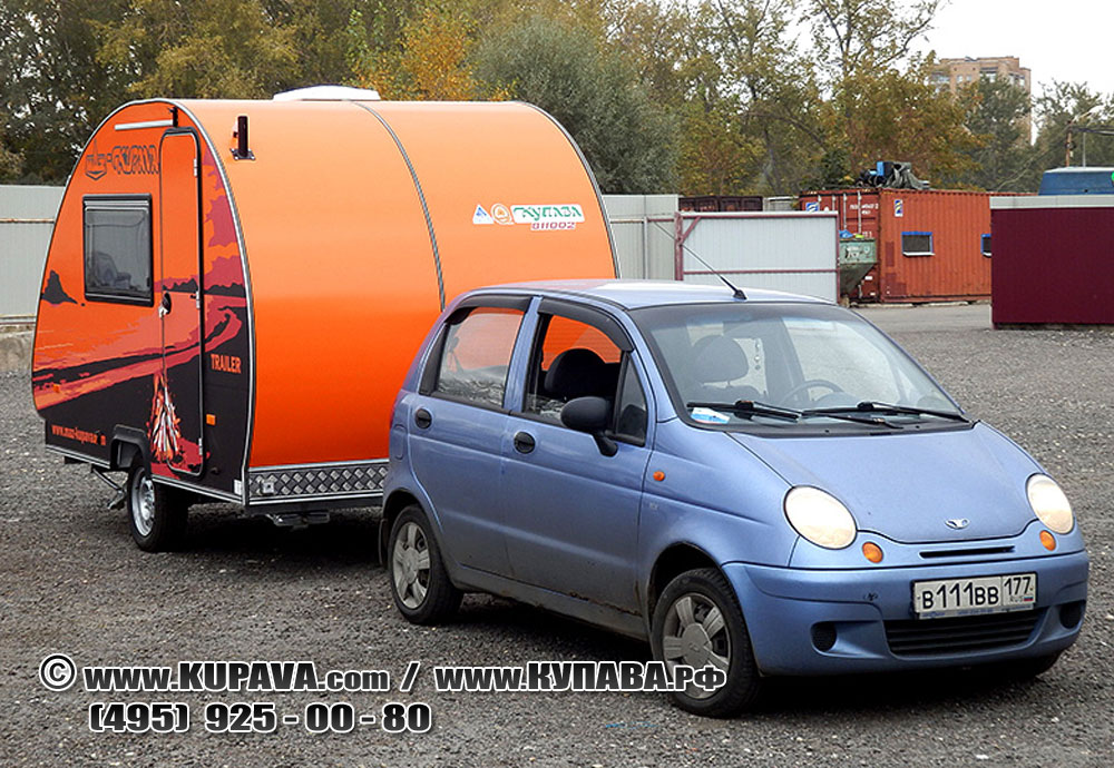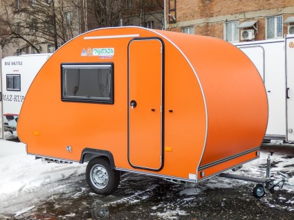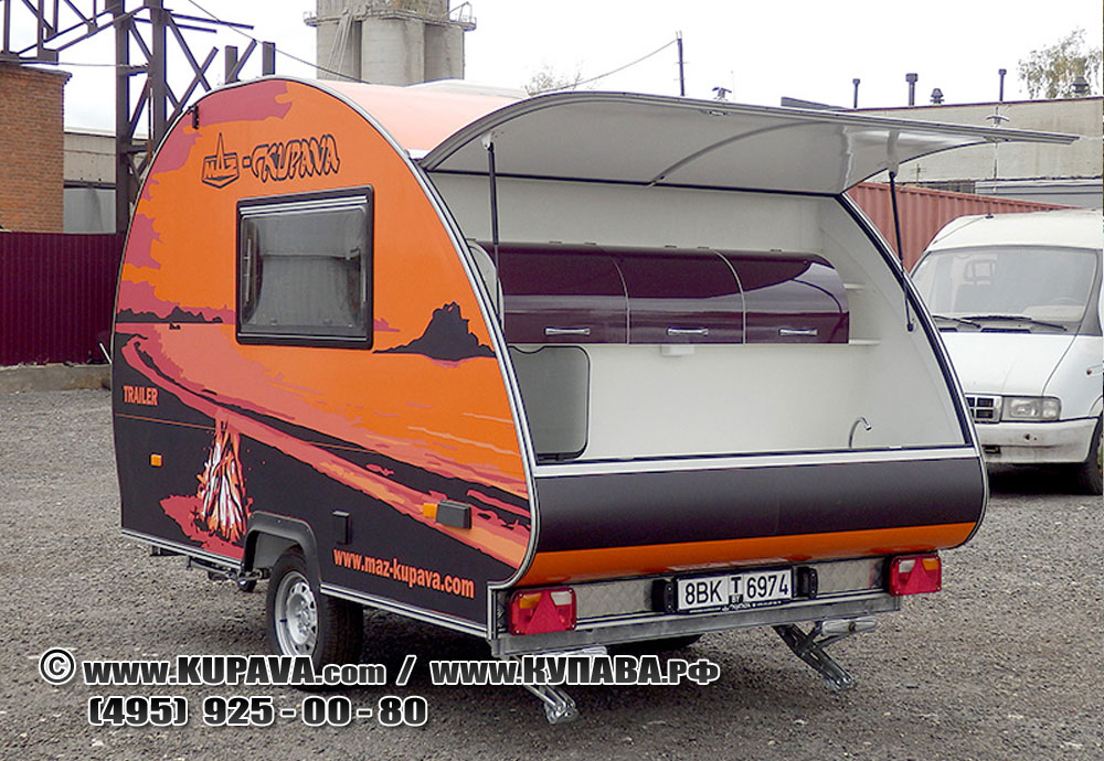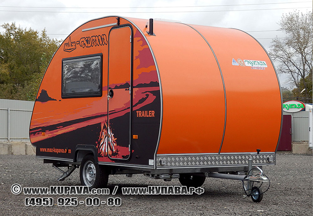 прицеп "Купава" мод.811002 (823100 турист-капля) (одноосный, жилая мебель, антресоли, газовый отсек, стол, двуспальное место, два боковых открывающихся окна, вентиляционный люк, светодиодное освещение, газовая плита, автономное водоснабжение) (цвет кузова может отличаться от представленного на фото)