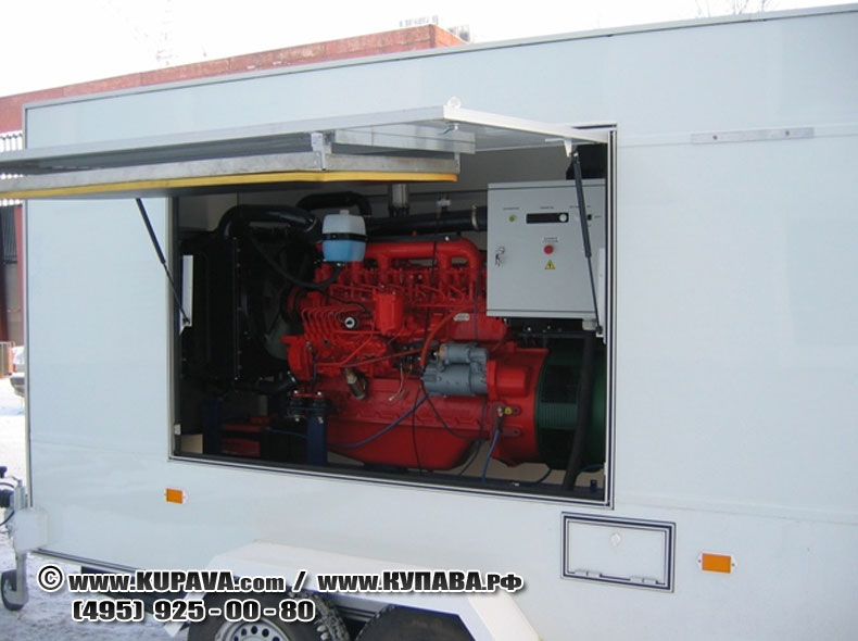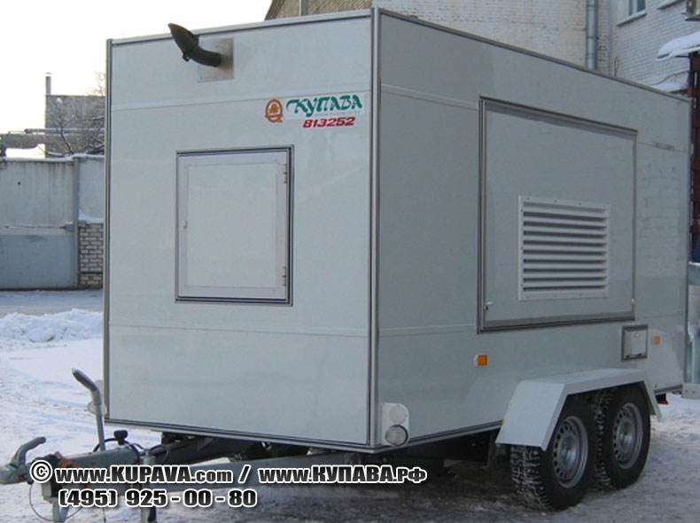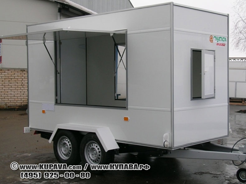 Грузовой прицеп «Купава» предназначен для установки и перевозки различного оборудования Кузов выполнен из сэндвич-панелей: - наружная обшивка: ДВПо, наполнитель пенополистирол; - внутренняя обшивка: лист алюминиевый, окрашенный. Покрытие пола: лист оцинкованный стальной. Дверной проем: нержавеющая сталь. Фурнитура: импортная нержавеющая. Окантовка кузова: алюминиевый профиль. 2 ставни в боковых стенках и люк в передней стенке. Нанесение наружной рекламы по эскизам заказчика.
