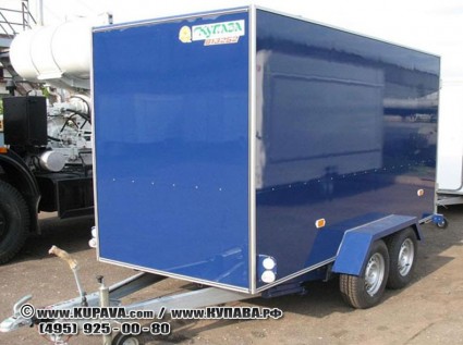 Грузовой прицеп «Купава» предназначе для перевозки различных грузов легковым автомобилем Кузов выполнен из сэндвич-панелей: - наружная обшивка: окрашенный лист стальной или пластик; - внутренняя обшивка: окрашенный лист стальной или пластик. Покрытие пола: линолеум, автолин, поддон рифленый алюминиевый, полиуретановая заливка, лист оцинкованный стальной. Дверной проем: нержавеющая сталь. Фурнитура: импортная нержавеющая. Окантовка кузова: алюминиевый профиль. Закладные элементы под ХОУ. Теплоизоляционная штора. 2 ставни в боковых стенках и люк в передней стенке. Нанесение наружной рекламы по эскизам заказчика.