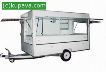 Одноосный прицеп Купава, предназначенный для розничной торговли и приготовления кур-гриль и шаурмы, оборудован под установку газового гриля.