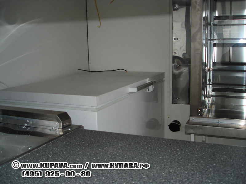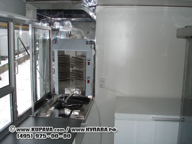 В возможную комплектацию входит гардеробный шкаф с дверью, тумба с мойкой из нержавеющей стали, торговый прилавок со смотровой витриной под столешницей, алюминиевая рама остекления, место под ларь, зашивки колесных ниш, внутреннее освещение 220В, электропроводка 3,5кВт