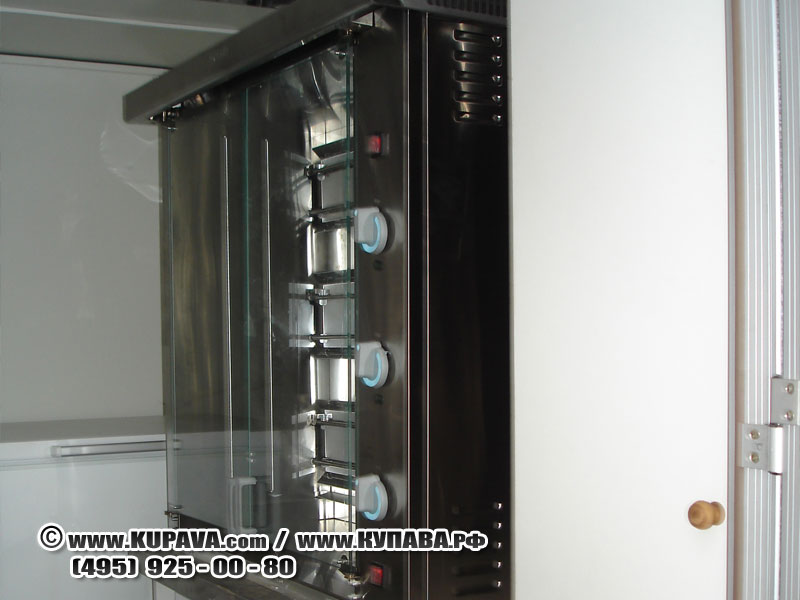 На фотографии представлена модификация прицепа оснащенная: - газовым грилем; - холодильным ларем; - вытяжной вентиляцией, термоизоляцией, газовым отсеком;
