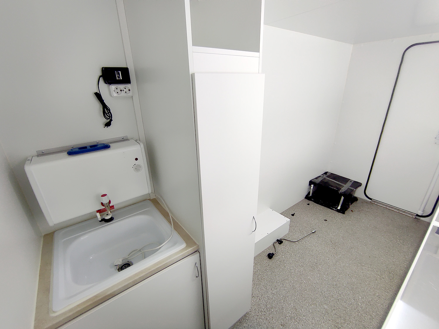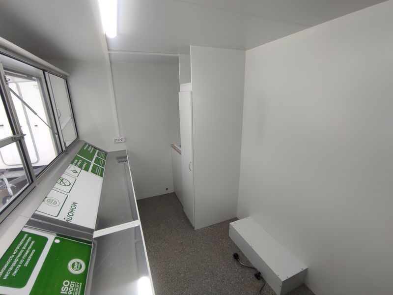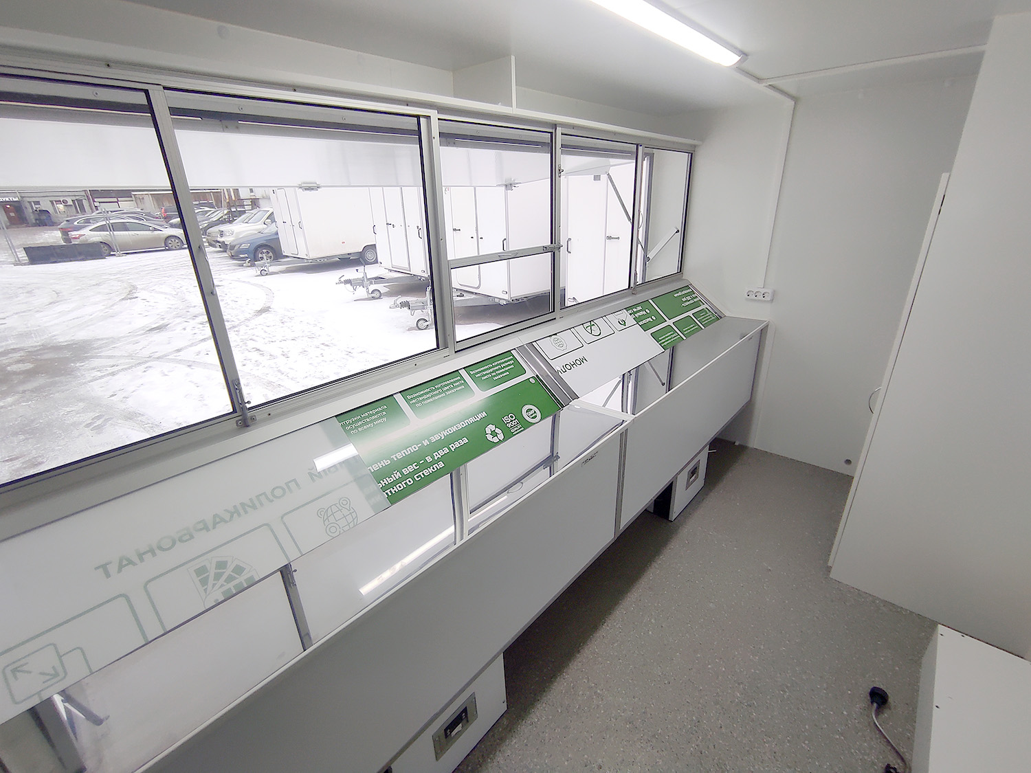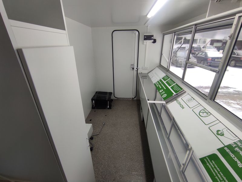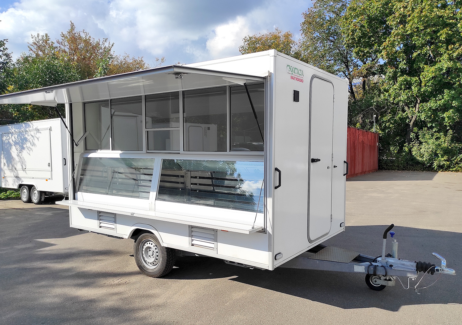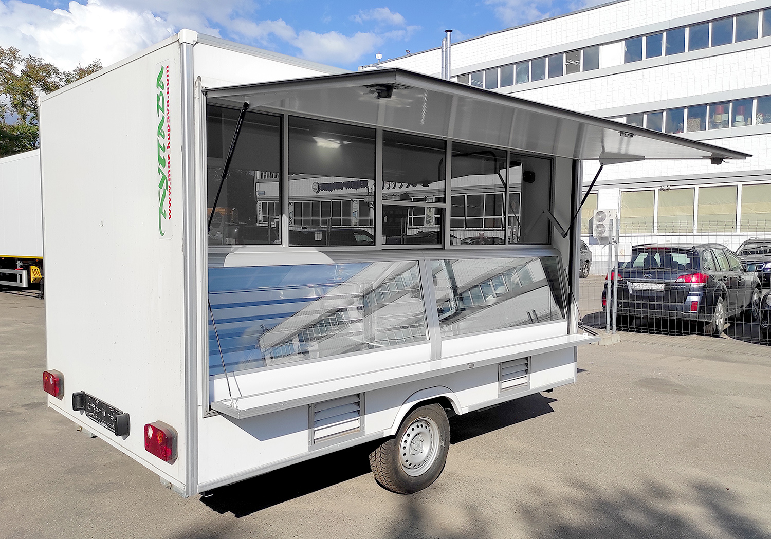 В данной комплектации: - торговая мебель из ламинированной ДСП - усиленная ось прицепа (увеличение полной массы и грузоподъемности) - алюминиевая рама остекления - автономное водоснабжение (тумба с раковиной, погружной насос, контактный кран, две канистры по 20л, блок питания 12В) - блок розеток + внутреннее освещение (один светильник) - две холодильные витрины ЛЮКС, 300л, -6…+6С (дл.1.6м, компрессор EMBRACO, активная оттайка испарителя, сливного поддона и патрубка (гибкий тэн, двухдатчиковый микропроцессорный блок управления), подсветка, полка для весов)
